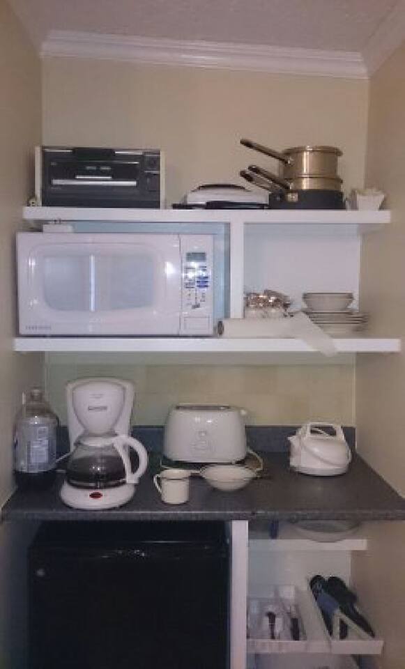 We understand the importance of feeling a sense of comfort when away from home, which is why we have equipped our half-kitchenette with the basics you may need. From cooking ware, plates, cups, and cutlery to a mini fridge, coffee maker, kettle, toaster oven, stove, and even a selection of spices, we've got you covered. Prepare your favorite meals just the way you like them and savor the flavors of home. Relax and unwind in the cozy ambiance of our cottage or cabin, where you can enjoy a glass of your favorite wine. If outdoor cooking is more your style, take advantage of our shared BBQ area and grill up a delicious steak while enjoying a cold beer. As the night falls, gather around our fire pit and let the crackling flames create the perfect setting for sharing stories under the sparkling starlit sky. During your stay, you'll have access to a range of on-site amenities designed to enhance your comfort and convenience. Each room is equipped with air conditioning to ensure a pleasant temperature, and while we do offer WiFi on site, please note that the reliability of the connection may vary in the rooms due to limitations set by the service provider.
